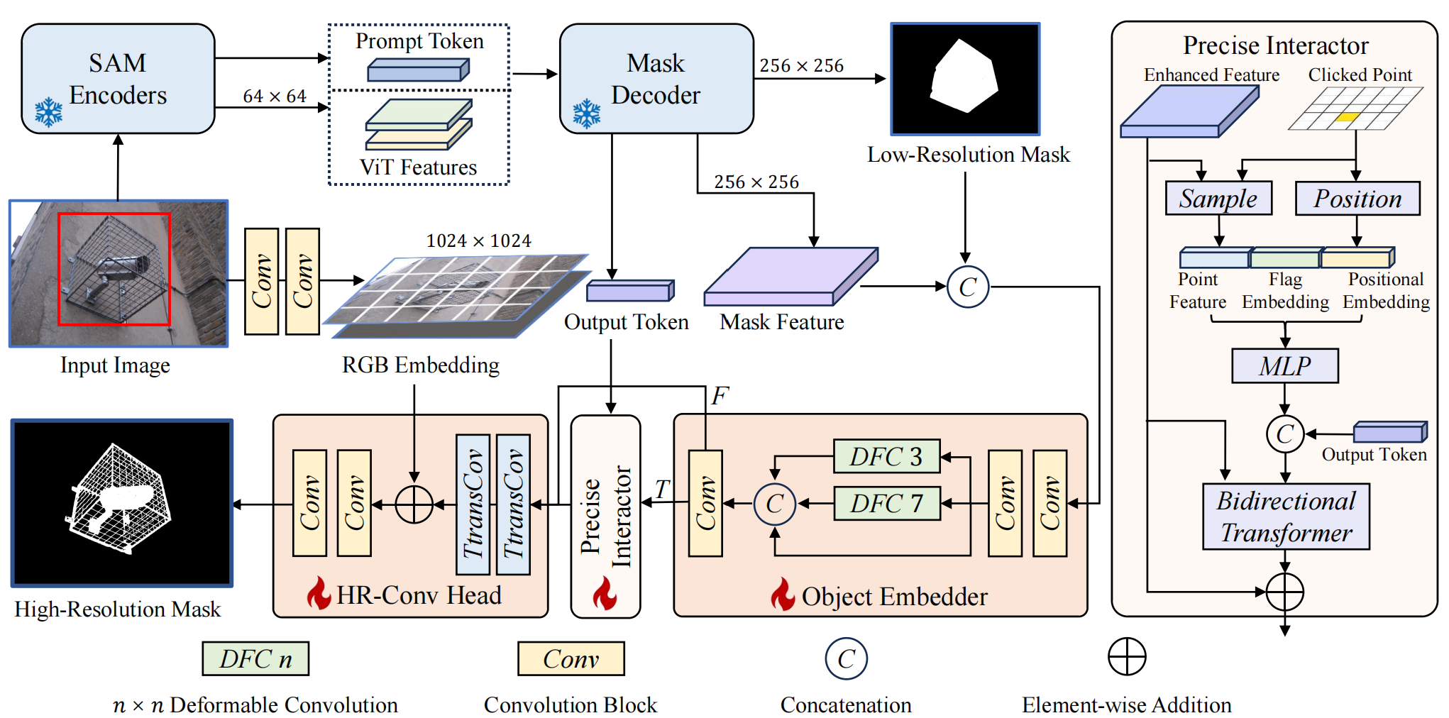 图2:所提出的Pi-SAM模型图。我们提出了两个附加模块:高分辨率掩码解码器和精确交互器。高分辨率掩码解码器由对象嵌入器和高分辨率卷积头(在图中称为HR-Conv Head)组成。对象嵌入器增强了SAM输出的低分辨率掩码特征。HR-Conv Head替换了SAM基于点积的输出层,以生成高分辨率的预测。精确交互器是一个可选模块,允许用户通过点击错误预测区域来识别预测中的不准确之处,然后自动进行校正。