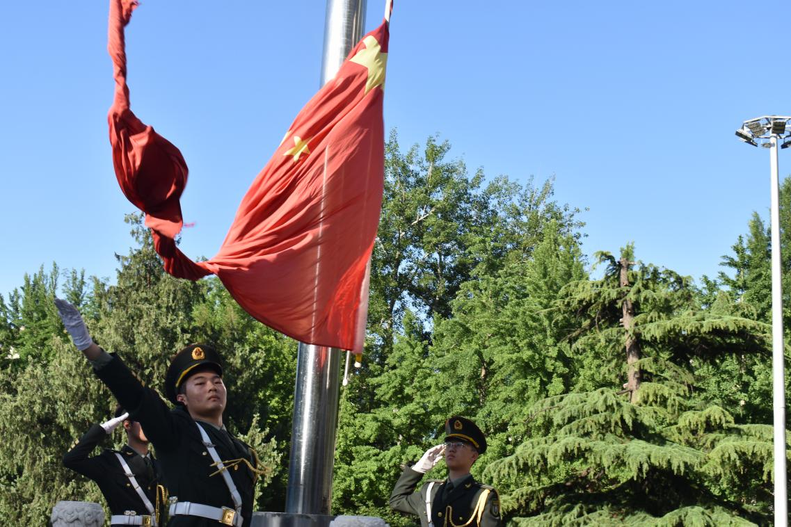 仪式开始,贾卓生为国旗仪仗队授旗。在庄严的注目礼下,伴随铿锵有力的国歌,鲜艳的五星红旗冉冉升起,迎风飘扬。