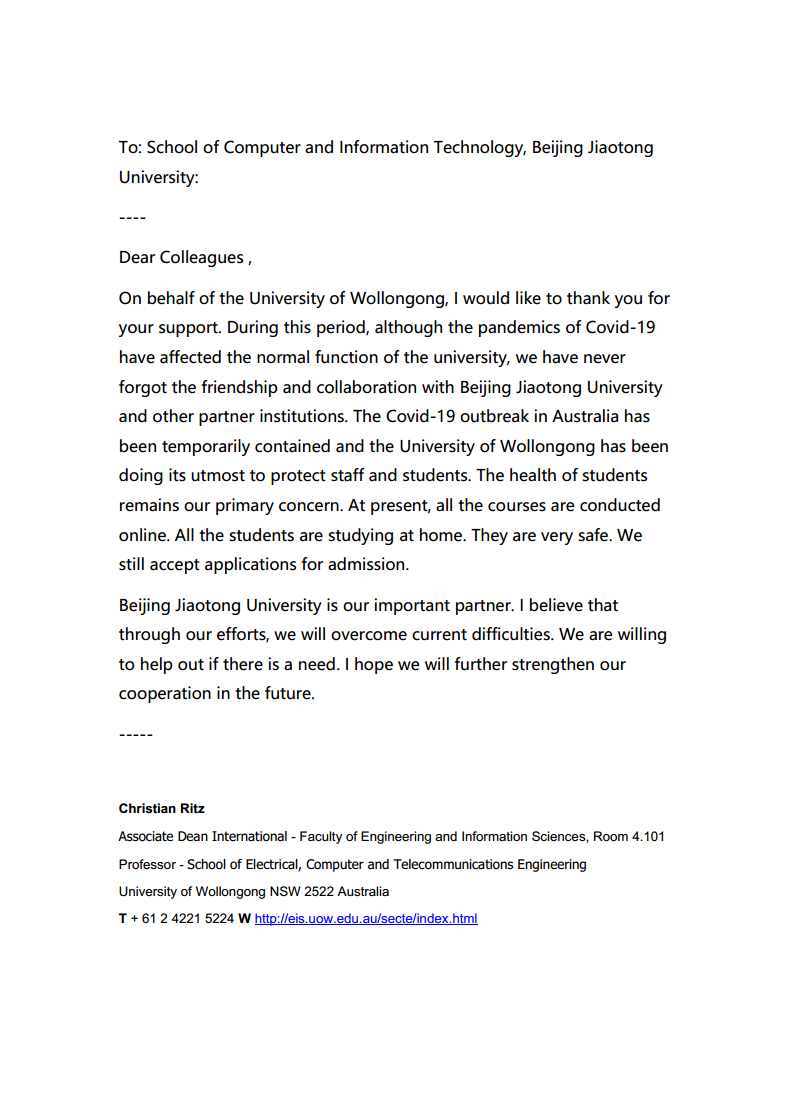 伍伦贡大学电子,计算机与电信工程学院副院长Christian Ritz教授在信中写到,“我代表伍伦贡大学,感谢您的支持。这段时间,尽管新冠肺炎已经影响了嗨皮漫画 的基本运转功能,但我们从未忘记和嗨皮漫画 的友谊和合作”,“嗨皮漫画 是我们的重要合作伙伴。我相信我们可以共渡难关,如果贵校需要任何帮助,我们一定伸出援手。我希望在未来进一步加强双方合作”。伦敦城市大学副校长Stanton Newman教授在信中写到,“我代表伦敦城市大学向您表示深深的感谢,您慷慨捐赠的口罩不仅向奋战在抗击新冠肺炎一线的工作人员提供了宝贵的个人防护物资,更是重申了我们国际合作关系的重要性和价值”,“我想特别感谢计算机学院的杨萌女士,她和我的同事们多次沟通,最终将口罩顺利寄到了英国,在目前的情况下这不是一件容易的事”。