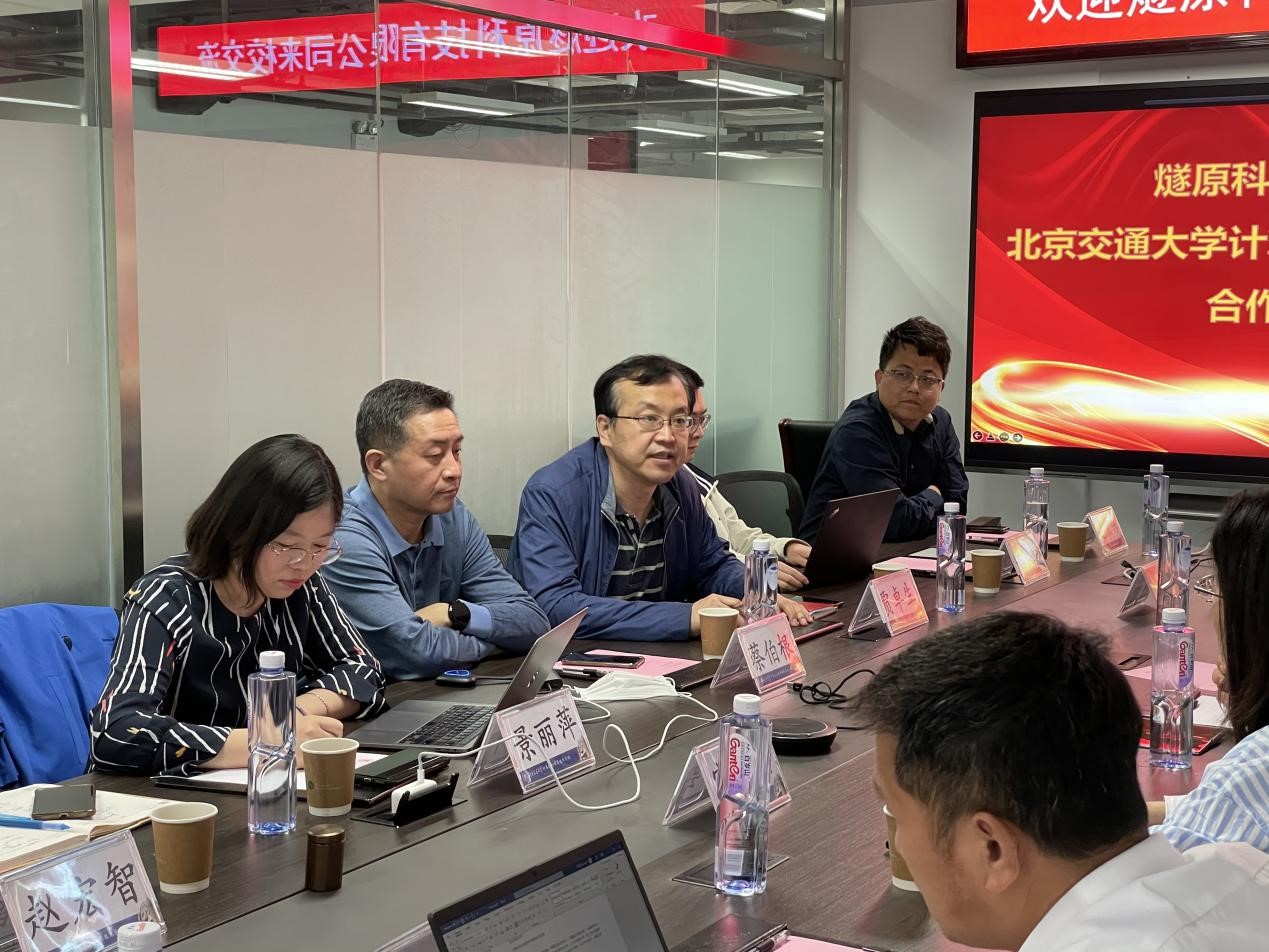 计算机与信息技术学院研究生服务中心主赵宏伟、电子信息工程学院教授文韬、计算机与信息技术学院校企合作秘书王侃,燧原科技有限公司行业生态总监高福存⼀同出席了座谈会。