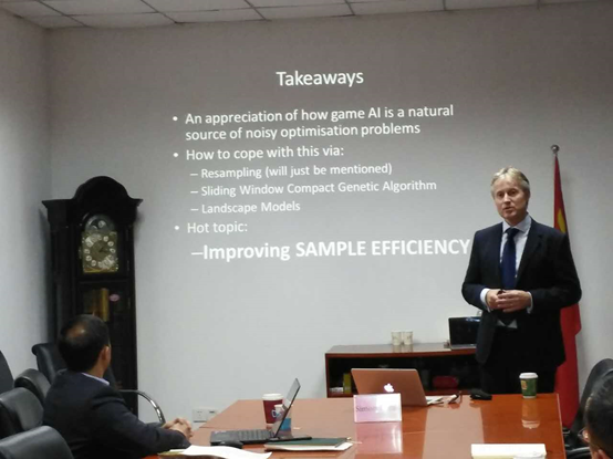 随后,Simon Lucas教授为嗨皮漫画 师生做题目为“Game AI, Game Design and Noisy Optimisation”的讲座,并与师生热烈讨论。