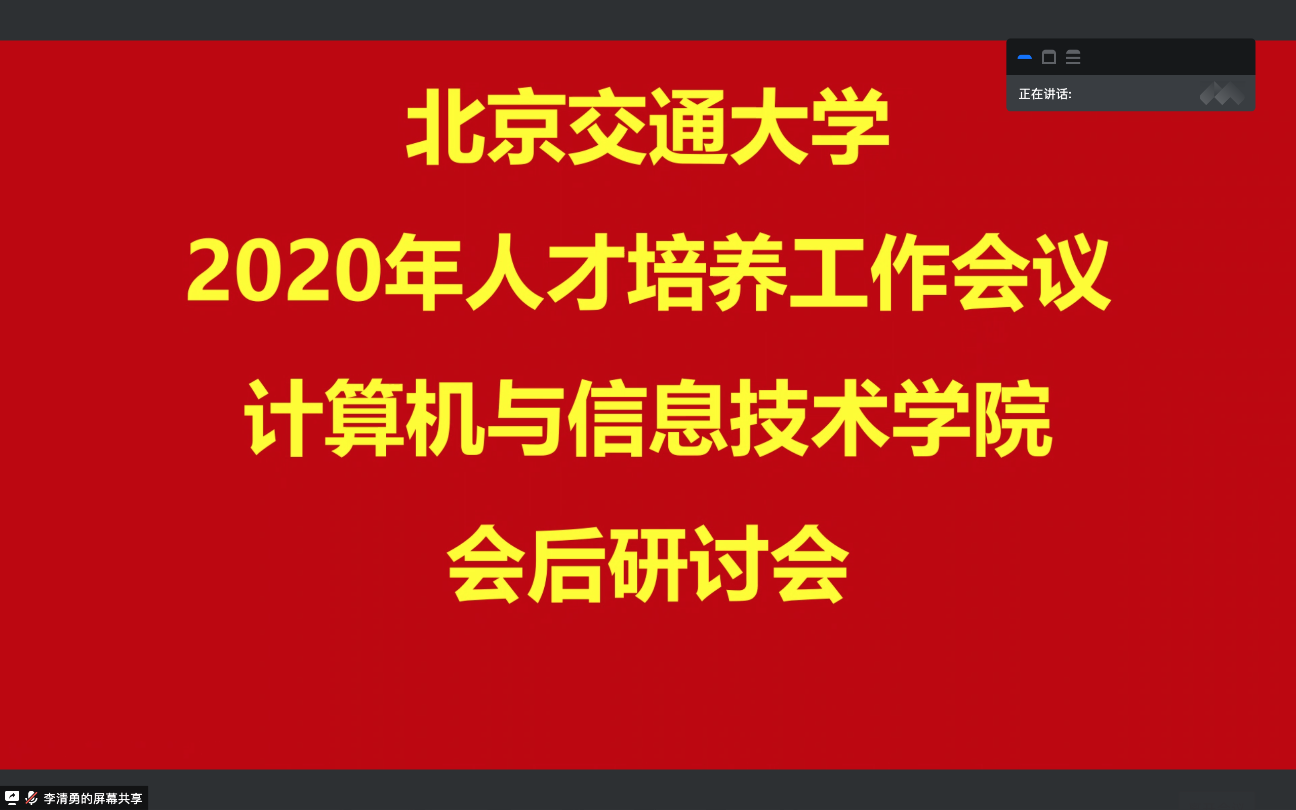 蔡伯根院长介绍了计算机学院2020年人才培养工作的整体概况和重点工作,李清勇副院长汇报了本科生人才培养现状、面临挑战、思考举措,林友芳副院长汇报了研究生人才培养方案修订的主要内容和问题及思考,李浥东副院长汇报了新形势下学院国际化与科研助力“四通”人才培养工作,董敬祝副书记和王浩业副书记分别汇报了学院在研究生和本科生人才培养过程的思政工作。