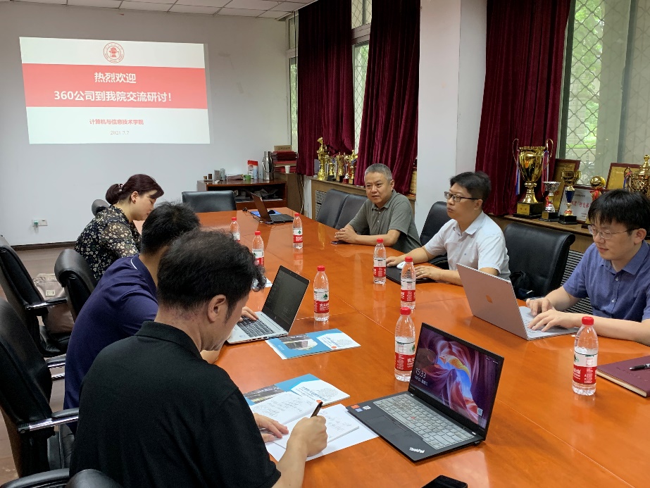 2021年7月7日下午,计算机学院在九教北111会议室召开了与360公司的产学合作交流研讨会。360公司教育事业部总经理李强等一行四人到访,会议由副院长熊轲主持,信息安全专业王健、李超等老师出席了此次研讨会。