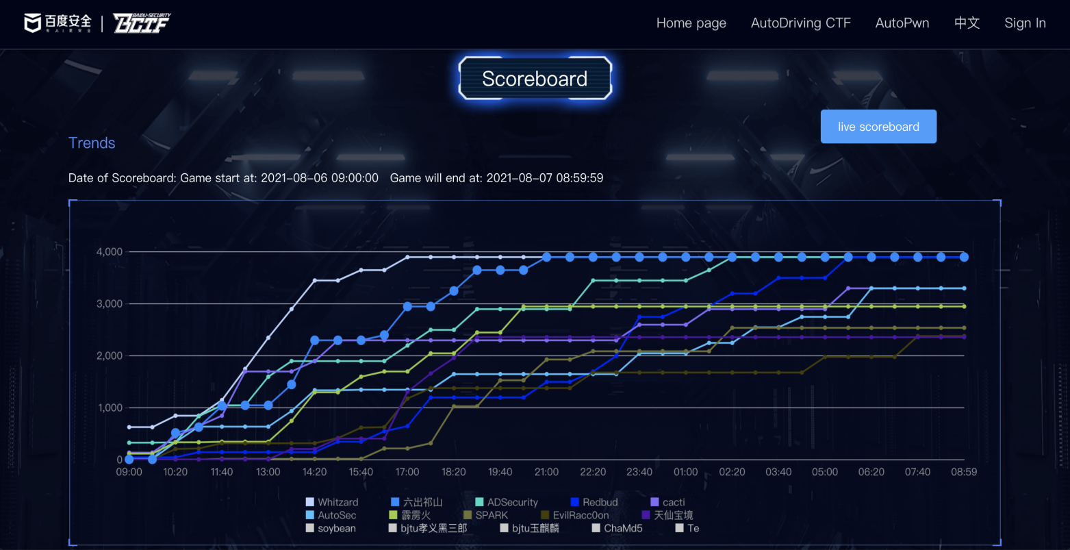 最终,来自全球50个国家和地区的近100支战队参加了比赛。其中,共有4支战队跑完全程获得3890满分,其中“Whitzard”队8小时摘得桂冠、嗨皮漫画 “六出祁山”队以12小时获得亚军,“ADSecurity”队和“Redbud”队分别耗时17小时20分、 20小时40分钟跑完全程。
