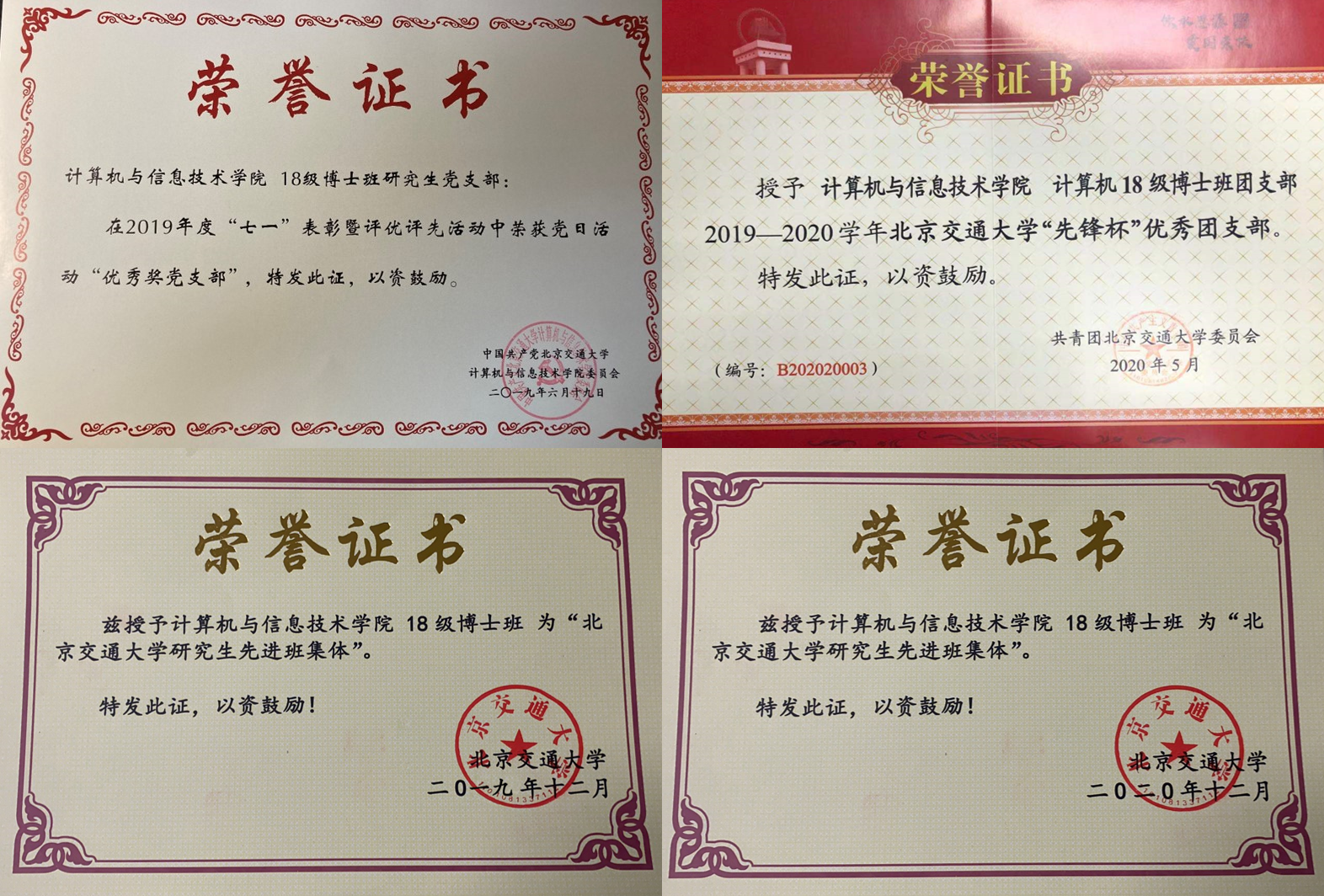 计算机与信息技术学院2018级博士生党支部成立于2018年9月,现有正式党员28人,预备党员6人,占班级人数的71.4%。支部依托计算机科学与技术学科(第四轮学科评估A-类学科)建设,成立以来党支部坚持旗帜鲜明讲政治,推动“党团班舍”协同前进,促进“党建引领科研”创新发展,打造充满“合力、活力、效力、实力”的博士生党支部。