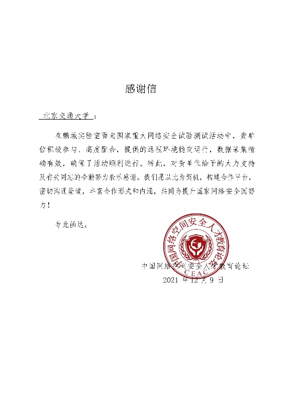 计算机学院信安团队参与国家重大网络安全试验测试活动获感谢信