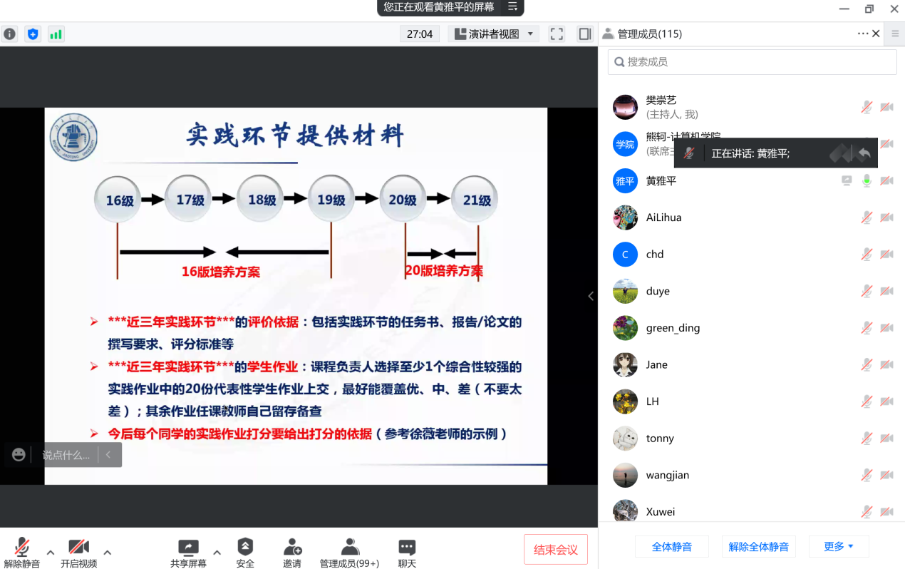 之后熊轲通报了前9周线上教学督导和学生的调研结果,强调当前疫情态势依然严峻,随着本学期线上教学活动的持续,学生、家长和老师都出现了一定程度的焦虑情绪,全院教师要重视线上课堂教学质量、加强与学生的在线互动及答疑、积极配合校院两级督导的听课和指导、及时向学院反馈线上教学出现的新情况,课程负责人要组织任课教师团队针对课程特点进行线上教学研讨、提前做好期末线上考试的预案,本科毕业设计导师要切实做好对学生的指导和毕设论文工作质量的把关,并对近期学院教学工作重点进行了说明和具体部署。他还指出,老师们要以本次专业认证为契机,深化对本科人才培养质量的理解,进一步规范课程的教学活动,把学院本科教学工作质量推向新的高度。