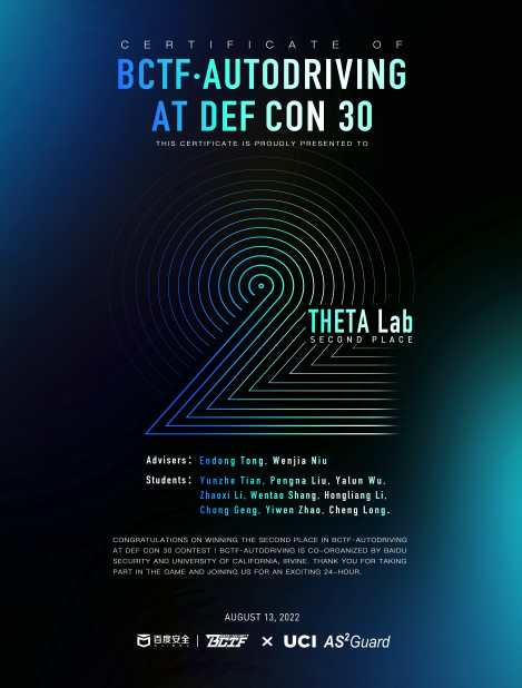 2022年8月14日零点,由百度安全(BCTF)和加州大学尔湾分校(UCI)联合承办的DEFCON 30 BCTF AutoDriving赛事圆满落下帷幕。嗨皮漫画 网络空间安全学科责任教授刘吉强老师领队、信息安全系童恩栋老师和牛温佳老师指导的“THETA Lab”团队突破了23道赛题获得4310分,在百余支国内外高校战队中位列解题榜第二名。这是该团队在DEFCON(被称为黑客“奥斯卡”)的赛事中的第二次获奖,是对去年获奖的又一次沿袭。