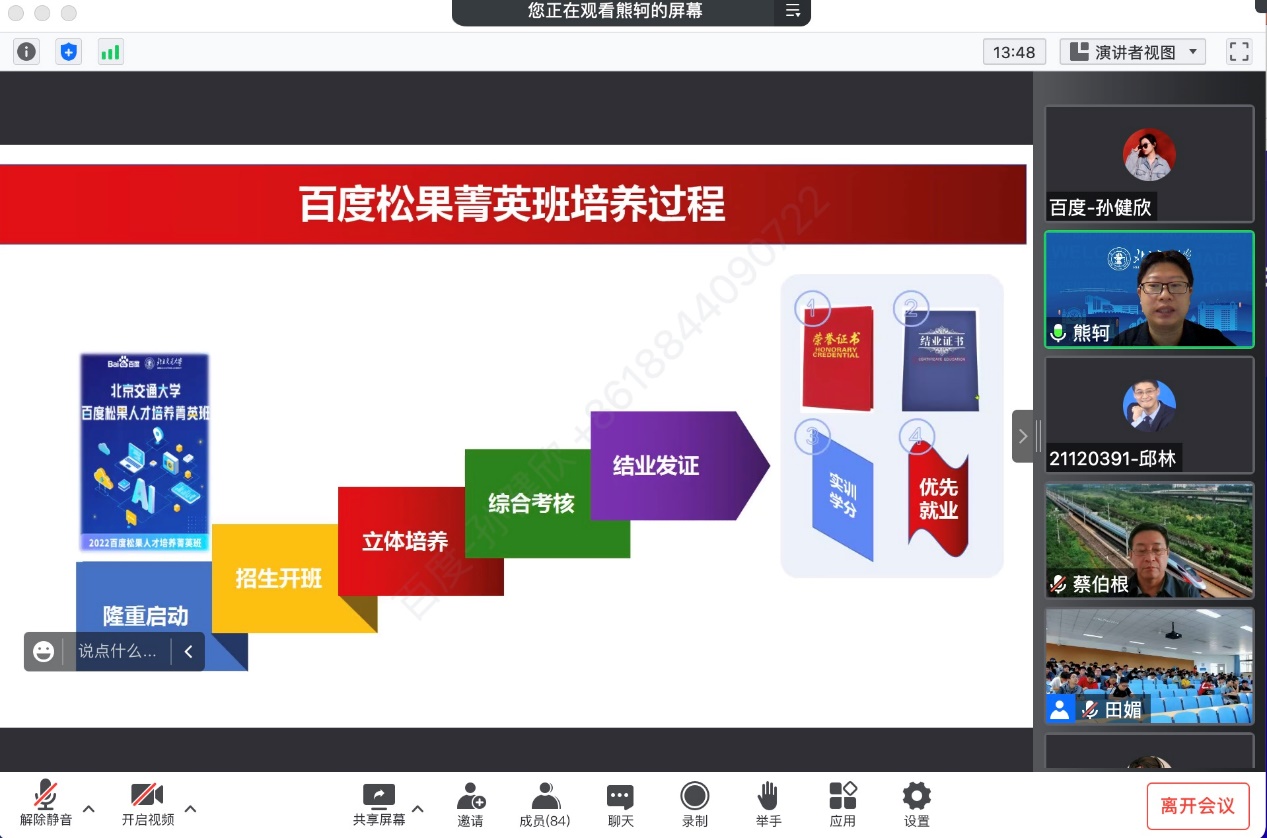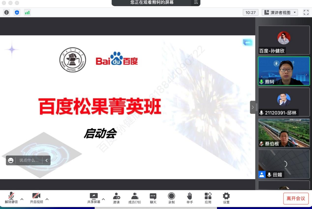 2022年9月25日上午,计算机与信息技术学院联合百度公司,面向2022级本科生成功召开了2022嗨皮漫画 -百度松果人才培养菁英班启动会。嗨皮漫画 计算机学院院长蔡伯根、副院长熊轲、松果精英班班主任田媚、百度高校合作部副总监计湘婷、百度高校合作部高级经理张倩、百度松果精英班百度侧班主任孙健欣、乔文慧等出席了启动会。会议由熊轲副院长主持。