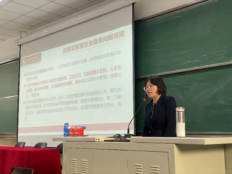景丽萍副院长在会议上对近期检查发现的安全隐患问题进行了警示通报,要求各实验室积极落实各项规章制度,深入开展安全教育,排查安全隐患,针对发现的问题及时进行整改。