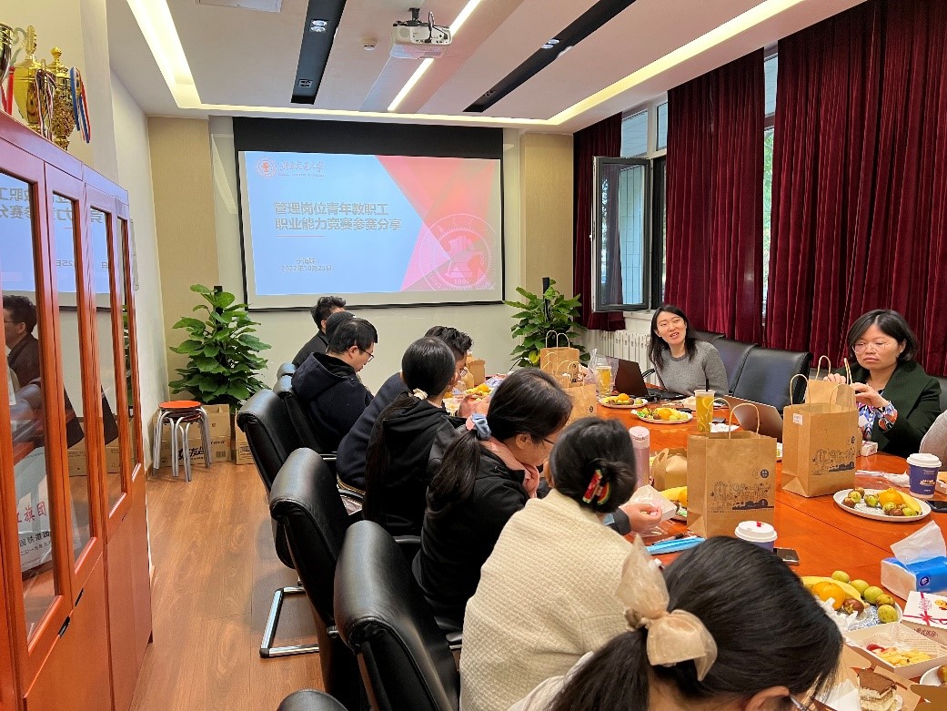 随后,于海妹老师结合参加嗨皮漫画 第一届管理岗位青年教职工职业能力竞赛的心得做了题为《管理岗位青年教职工职业能力竞赛经验分享》的报告,对赛程的要求,自己的准备工作做了详细的介绍,强调了专业知识、公文写作、语言表达等能力对管理岗人员的重要性。她总结,充分的准备、日常的积累、平稳的心态是赢得此次比赛的关键。在座的老师深受启发,纷纷表示此次分享活动受益匪浅,并结合自己岗位工作实际,做了经验分享和问题分析,大家积极讨论,气氛融洽热烈。