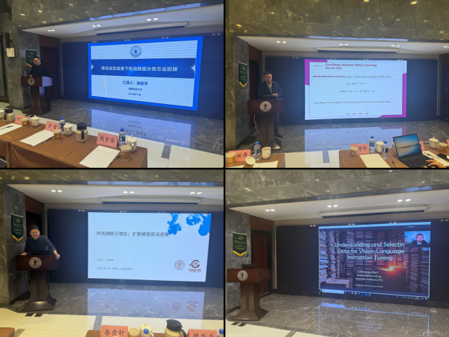国防科技大学侯臣平教授以“特征动态场景下的流数据分类方法初探”为题,按照特征动态变化程度和标记不确定性程度逐步增加的思路,讲述其课题组在相关方面的初步尝试和在面向开放环境的自适应学习方面的进展。南京理工大学罗雷教授以 “稳健表示学习方法研究”为题,介绍了其课题组在曲线度量学习、双曲度量学习以及自步加权核范数等稳健表示学习方法上的研究。中国人民大学李崇轩副教授以“扩散模型前沿进展”为题,介绍了连续扩散模型的理论、方法与应用,并探讨扩散模型的前沿进展。南洋理工大学李搏扬副教授以“在机器学习中如何理解并有效利用训练数据”为题,围绕大模型的指令调优,阐述了如何通过有效利用训练数据来提升模型的性能。